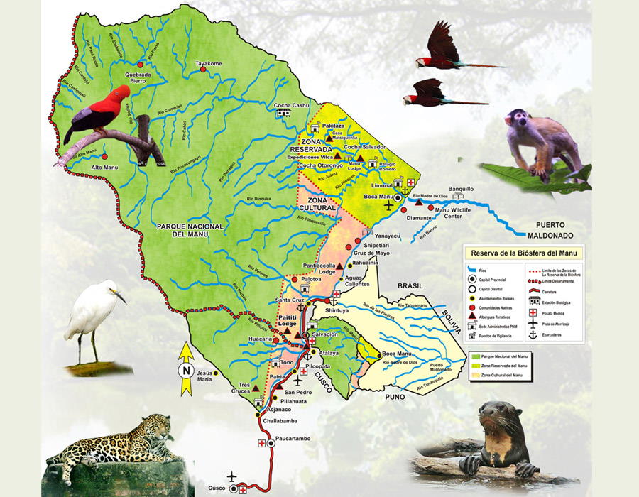 We will wake up under the song of the birds and our trek in the Amazon high forest, visiting agricultural plantations of coca, cassava and other native products of the place. In the path to the tourist port of Atalaya, we will observe a great variety of bird species, families of monkeys accompanied by spectacular waterfalls and then we will board our comfortable and equipped boat to start descending the turbulent waters of the Madre de Dios high river. At mid-afternoon we will start the trip by 3 hours in the tropical forest in search of birds, mammals, reptiles, medicinal plants and giant trees, where the famous lianas hang, where one can rock like a true Tarzan an unforgettable experience. Then our nature guide will illustrate the behavior and the interrelation that exists between the fauna and flora of the place.